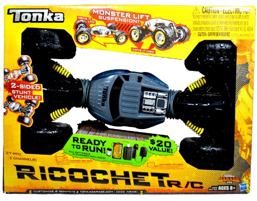 Playtime reaches new levels with the Tonka Monster Ricochet RC vehicle. Kids eight years and up will jump for the twist-left, twist-right, flip-over, and elevate action of this powerful remote-controlled racer. The vehicle's serpent-like movements will stop kids in their tracks when the Ricochet roars by, and the rechargeable battery will allow for hours of high-speed fun.